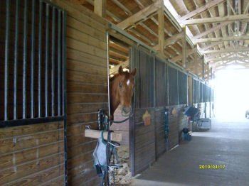 We have a fully equipped clay jumping ring and a separate dressage ring with lights. We also have a cross-country field for schooling. High and dry 16-stall barn with 12x12 stalls, 4-stall shed row in the front field, and 3 cement-floored wash racks in the back. On-site trailer storage is also available for an additional fee. Center-aisle main barn includes a tack room with saddle racks and space for your tack trunk, feed/hay room, office with bathroom, refrigerator, microwave, washing machine, and dryer are provided so you don't have to take your saddle pads and wraps home to be washed.